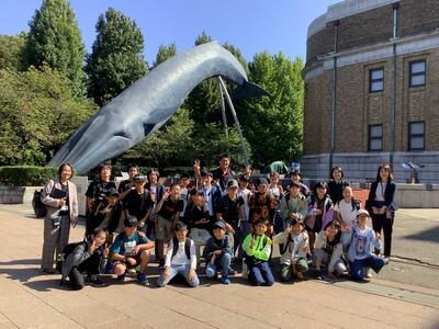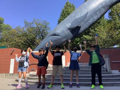 イルカのモニュメントの前で、クラスごとに集合写真を撮りました。