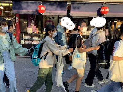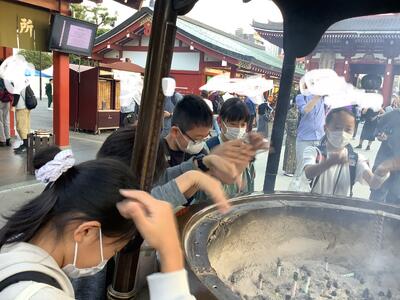 浅草寺の様子です。凶が多いことで有名なおみくじですが、見事大吉を引き当てた人もいました。はぐれないように繋がって散策している班もいて微笑ましかったです。