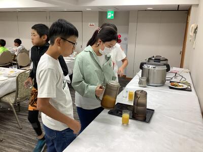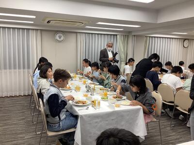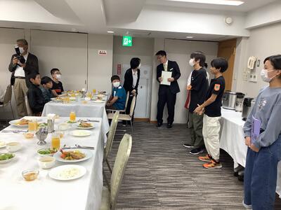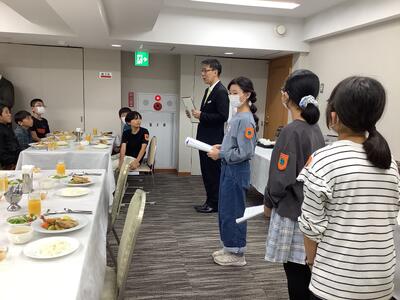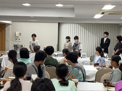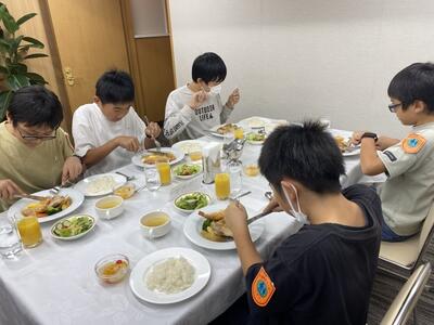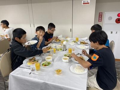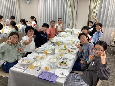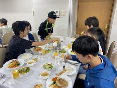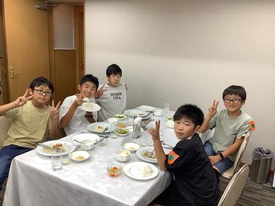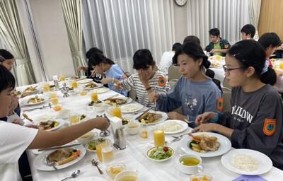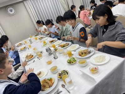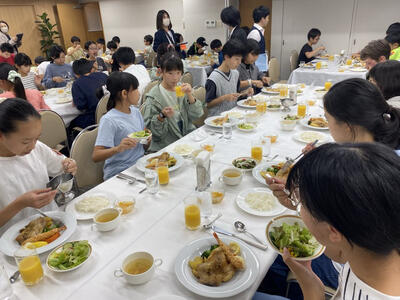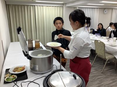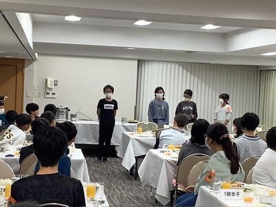ホテルに到着し、各部屋に荷物を置いた後は、食事会場へ。夕食のつどいでは、ホテルの方へ心を込めて挨拶をすることができました。ホテルの方からも注意すべき点を教えていただきました。