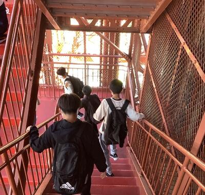メインデッキからは、階段を使っておりる班も。秋の空気は気持ちが良いですが下を見ると、ゾクゾクします。