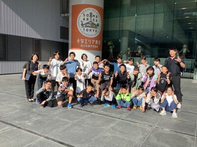 集合写真を撮り、次の場所である「明治なるほどファクトリー」に向かいます。ご飯も食べ終え、元気いっぱいの子供達です。