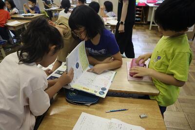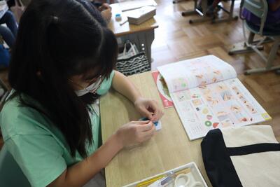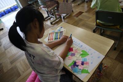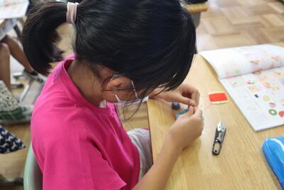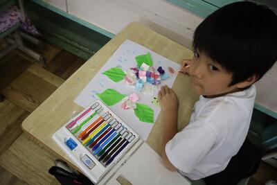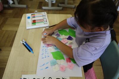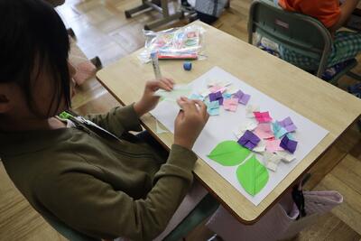1年生の図工の授業では、折り紙であじさいの花や葉を折って、画用紙に貼り作品に仕上げています。一つ一つあじさいの花を折り、色合いや貼る場所も考えていきます。夢中で作品作りに取り組む1年生です。あじさいの周りにいる生き物、カタツムリやカエルも描き加えると、さらにすてきな作品になりますね。