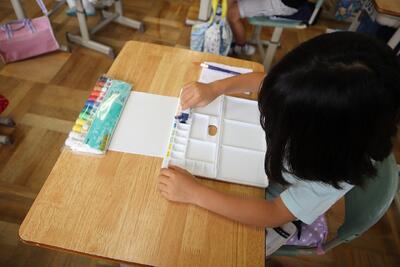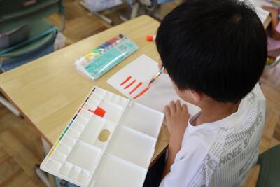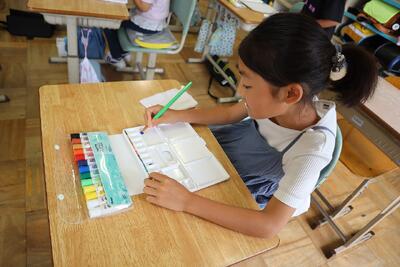 2年生から、絵の具をつかっての活動が始まります。今日の図工の授業では、絵の具セットの使い方をしっかり覚えました。初めての活動に、ワクワクドキドキの2年生。しっかり取り組む姿が立派でした。水の量で、絵の具の色合いが変わることにも気づいています。