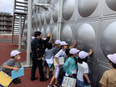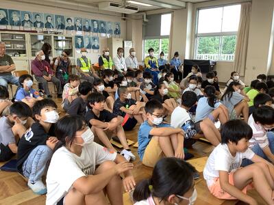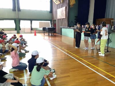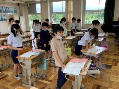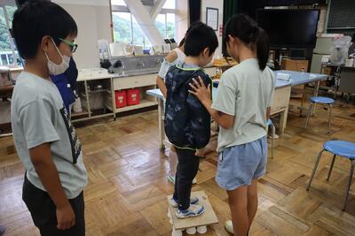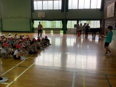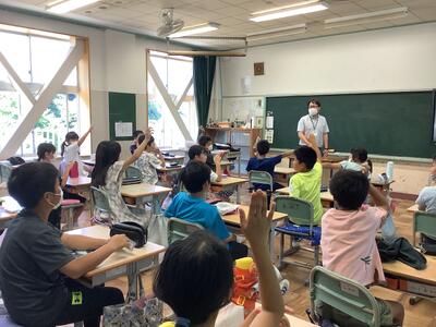 朝の時間に4年生の教室では、子供たちが、保健室の先生と栄養士さんのお話を聞きました。猛暑が厳しい毎日です。「熱中症にならないために、水分をしっかりとりましょう。」とお話がありました。普段と激しい運動をしたとき、どのような水分補給をしたら良いのか、わかりました。栄養士さんからは、ジュースの中に含まれている砂糖の量について、わかりやすく説明をしていただきました。子供たちは、反応しながらしっかりとお話を聞くことができました。自分の身体を自分で守るために、大切なことを知りました。