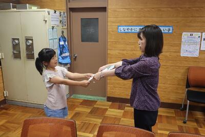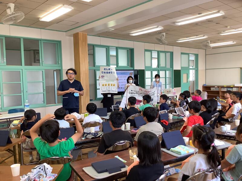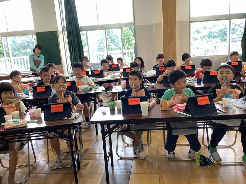 歯科医師や保健師の方に来ていただき、健口教室を行いました。歯の大切さや虫歯はどうやってできるのかを学び、染色液を使って上手に磨くための方法を教えてもらいました。