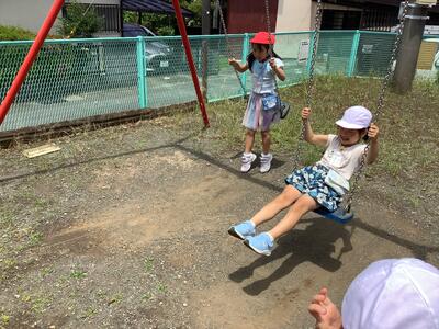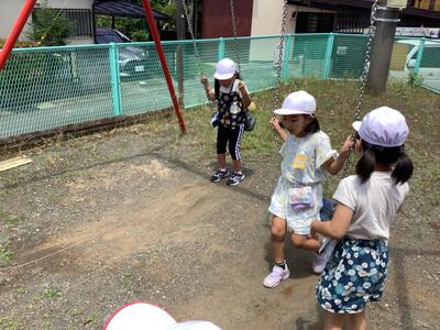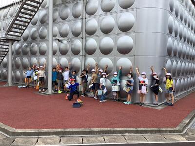 生活科の学習で、水遊びをしました。持ってきたペットボトルや容器にたくさん水を入れて、友達とかけ合ったり、遠くに飛ばしたりして楽しみました。