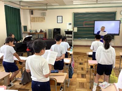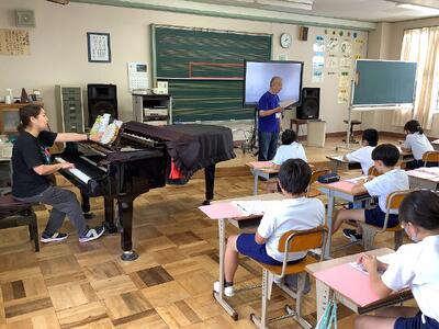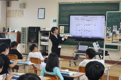 2年生の音楽の授業では、子どもたちが、鍵盤ハーモニカの演奏に取り組んでいます。指づかいにきをつけながら、演奏しています。みんなの音が1つになり、すてきな演奏になりました。