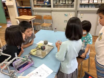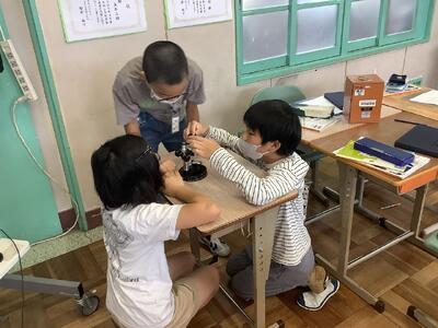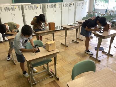 5年生の理科の様子です。メダカの雌雄をヒレに注目して判別しようとしたり、解剖顕微鏡を使ってメダカの卵の様子を観察しました。調節ねじを上手く使って、くっきり見れた時、とても嬉しそうにしている子どもたちでした。
