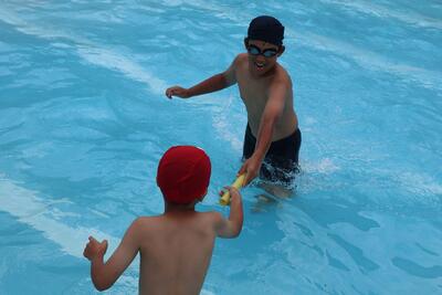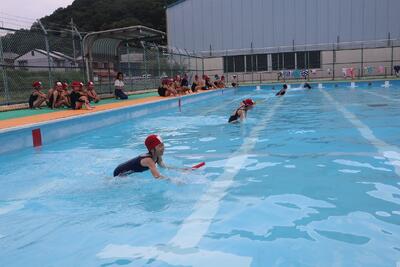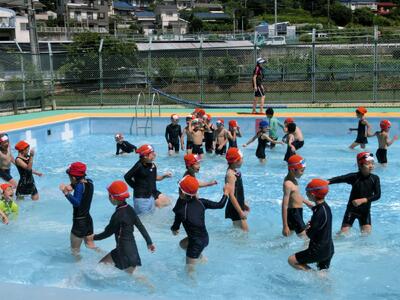 4年生がプール開きを行いました。6月4日の運動会では、学級対抗リレーで素晴らしいバトンパスをみせてくれた4年生。今日はプールの中でリレーをしました。歩いても泳いでもよいです。次の友達にしっかりとバトンを渡すことができました。安全に気をつけて、水泳の授業を進めていきたいと思います。