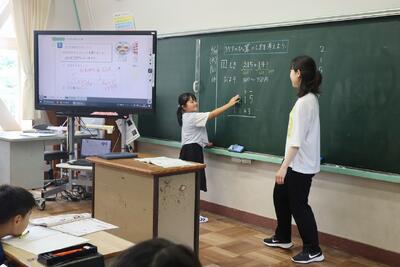 3年生算数の授業です。筆算の仕方を友達の前でしっかりと説明できます。自分の考えをいきいきと発表する姿、きらきらと輝いています。とてもすてきです。