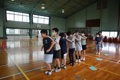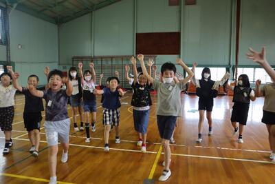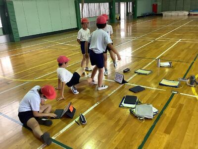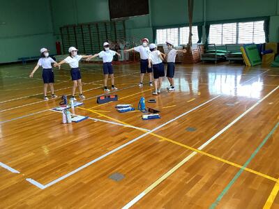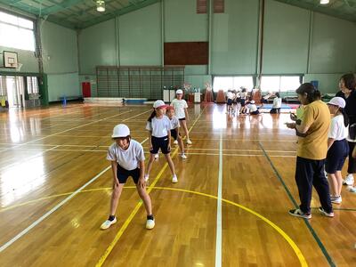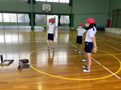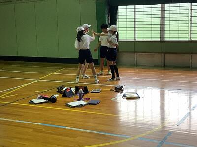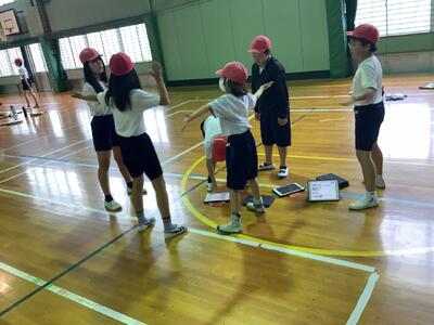 5年生の体育の様子です。自然教室のキャンプファイヤーの時間にクラスごと、創作ダンスを披露する予定です。自然教室ではクラスで4つの班があるため、1曲を4分割し、班ごとの担当を決め、振り付けを考えています。曲のリズムに合わせて、試行錯誤しながら楽しく活動していました。