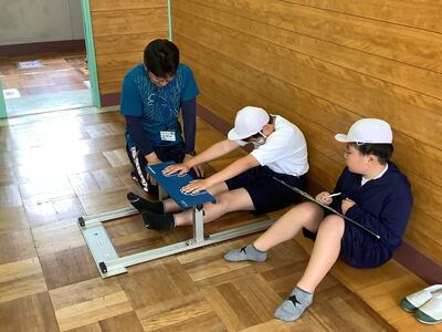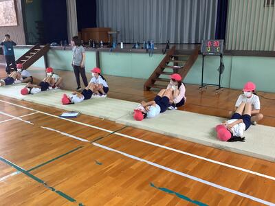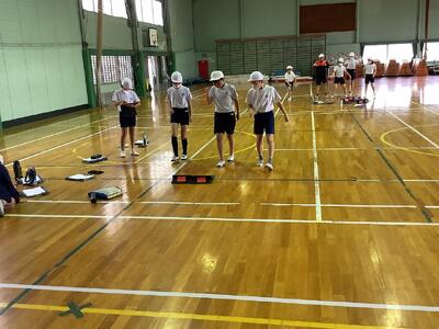 新体力テストが行われました。体育館で上体起こし、長座体前屈、反復横跳び、立ち幅跳びを、運動場で50メートル走とソフトボール投げの計測が行われました。