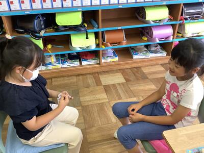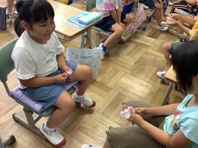 ペアで、たし算カードを使って学習しました。すらすらと、たし算の答えが言えるように頑張っています。
