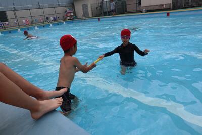 3年生体育の水泳の授業では、子供たちが自分のめあてにむかって、活動しています。今日はとても良いお天気です。
