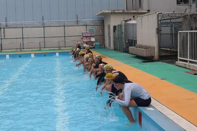 今日の5時間目には、2年生がプールで水泳の授業を行いました。子供たちは、顔を水につけたり、伏し浮きの練習をしたり、笑顔で参加する様子がみられました。
