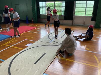 4年生の総合的な学習の時間のテーマは、「安全で安心のある生活」です。今日は、地震が起きた時の避難の仕方を学んだり、地震の揺れを体験したりしました。
