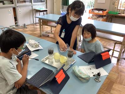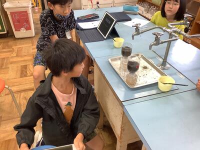 4年生の理科「雨水のゆくえと地面のようす」の学習で、①砂場の砂と②校庭の砂、どちらの方が水が染み込みやすいかをタブレットの中にあるストップウォッチ機能を使い、班ごとに実験をしました。砂場の砂の方が粒が大きく、隙間がある分、水が早く染み込むことがわかりました。