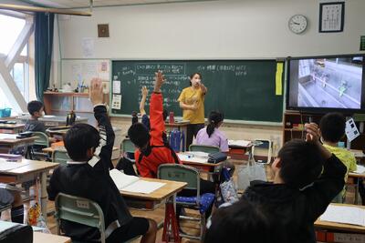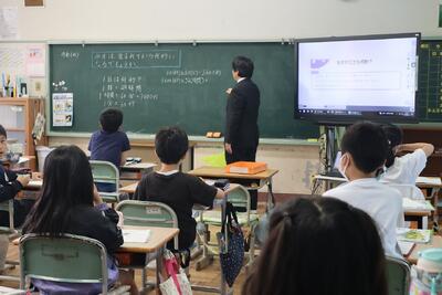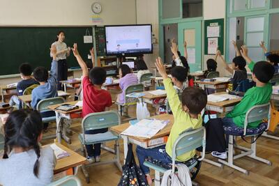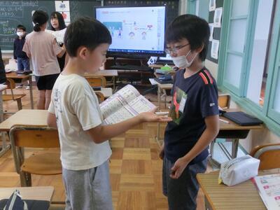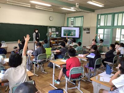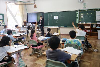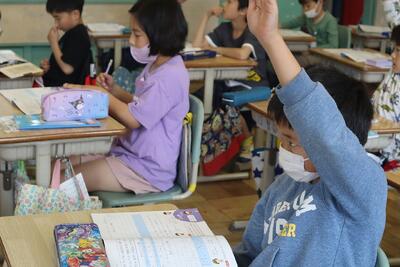 3年生の国語の授業では、子供たちが良い姿勢で、いきいきとわかったことを発表しています。ぴしっと伸びた手が、やる気満々ですてきです。
