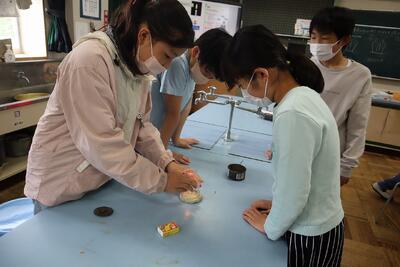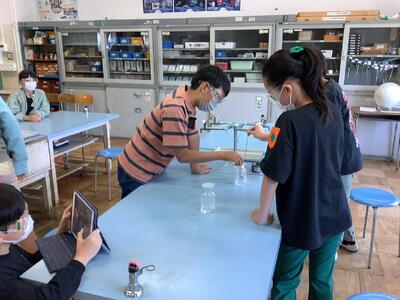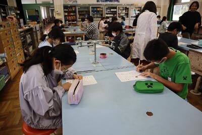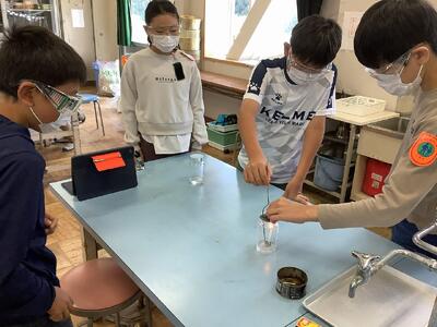 今日は、石灰水を使って、物が燃えた後の空気はどのように変化したのかを確かめました。実験の前に理科支援員の先生から、危険を伴う実験への心構えについてお話をいただき、真剣に取り組むことができました。
