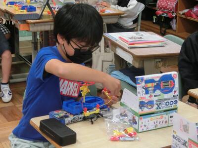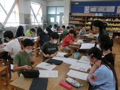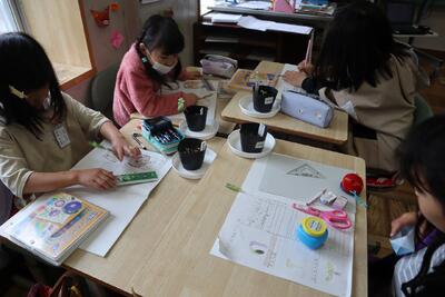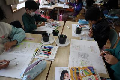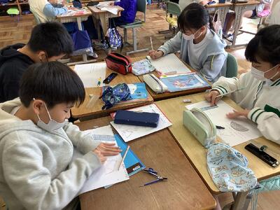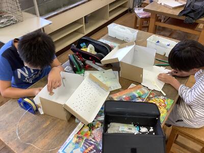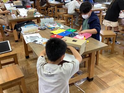 5年生の図工の様子です。自分の思い描く世界を箱の中に創作する単元です。自分の設計図を基に楽しそうに作成していました。
