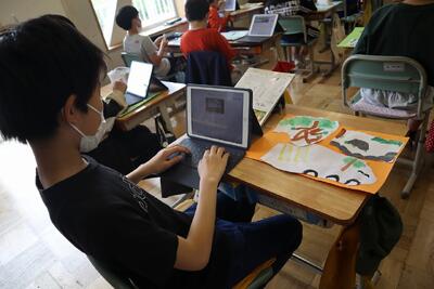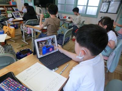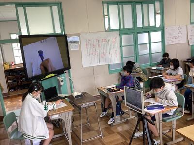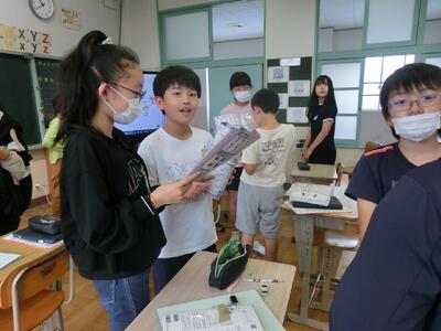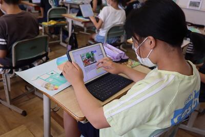 5年生の図工の授業では「絵の具スケッチ」の学習活動を進めています。校庭で自分のお気に入りの場所をスケッチしました。できあがった絵をちぎって、画用紙に自由な発送で貼り付けていきます。できあがった作品をタブレットで撮影しました。お互いの作品を見ながら、友達の作品についてコメントを書きます。良いところを伝え合うことで学びが深まります。