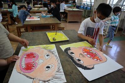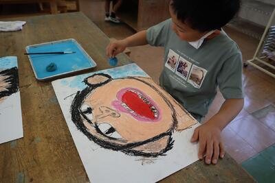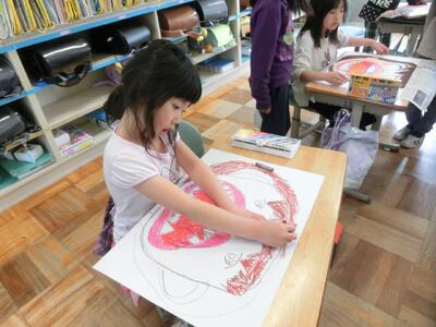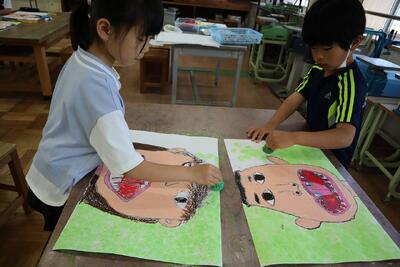 2年生は図工の授業で「はみがきをしている顔」の絵を描いています。みんな画用紙一杯に大きな顔を描くことができました。