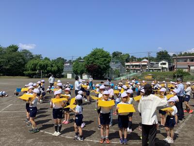 みんなで元気にラジオ体操。しっかり準備体操をしてプログラムスタート。体育委員長さんのかけ声が大きくてはきはきしていて、とても素晴らしかったです。