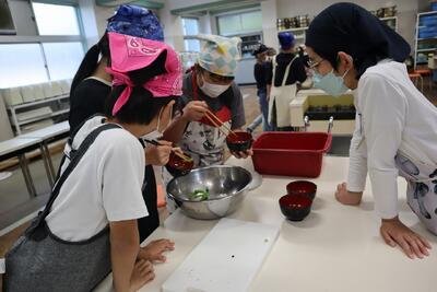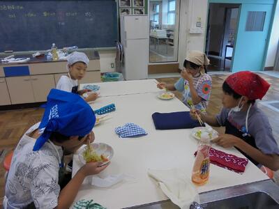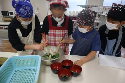 5年生の家庭科の授業では、調理実習が行われました。グループの友達と協力しながら、青菜をゆでて、ごま和えをつくりました。片付けまで能率良く進める姿、とても立派でした。