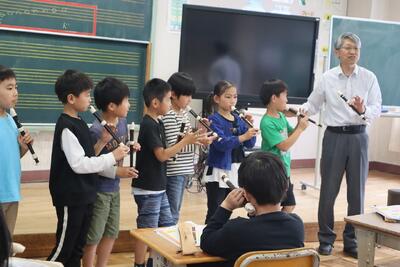 3年生の音楽の授業では、子供たちがリコーダーをつかって、きれいな音色を響かせていました。リコーダーの学習は3年生から始まります。子供たちは目を輝かせながら、夢中で取り組んでいます。指の腹をしっかりと穴に押しつけると、丸く跡がつきます。上手に音あなを押さえている証拠です。タンギングを意識しながら「シ」の音を吹いてみました。みんな素敵な音を出すことができています。友達の頑張る姿を見て、聴いて、応援したり拍手を送ったりできる3年生の子供たち、すてきです。