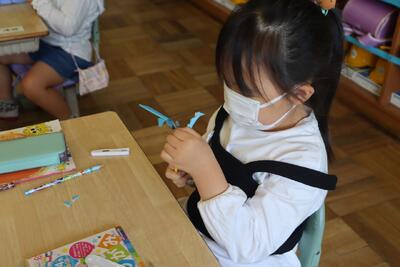 1年生の図工の授業では、子供たちが折り紙で「ちょきちょきかざり」にチャレンジです。折り紙を折ってからはさみでちょきちょき。上手にはさみをつかえる1年生です。折り紙を広げるとすてきな「ちょきちょきかざり」のできあがりです。