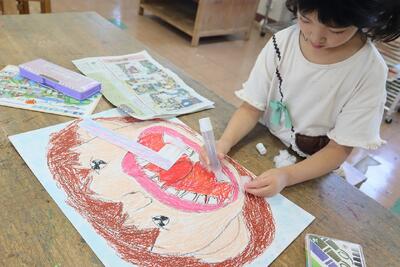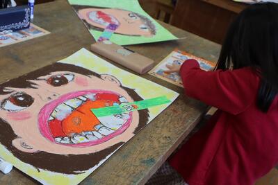 2年生の図工の授業では、子供たちが画用紙いっぱいに歯磨きの絵を描いています。今日の授業では、背景に絵の具を使って、色をつけていきました。トントンと上手に手を動かして、素敵な作品ができあがりそうです。