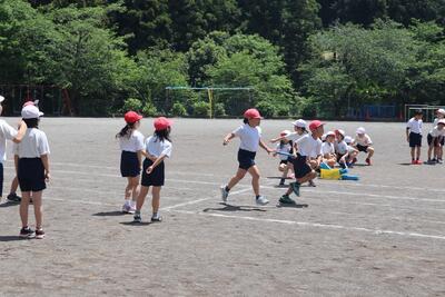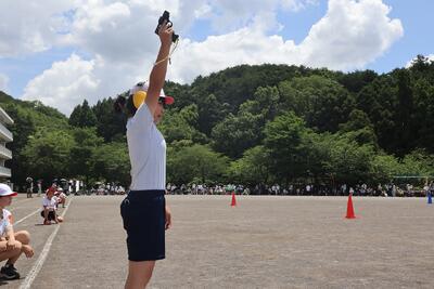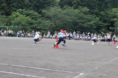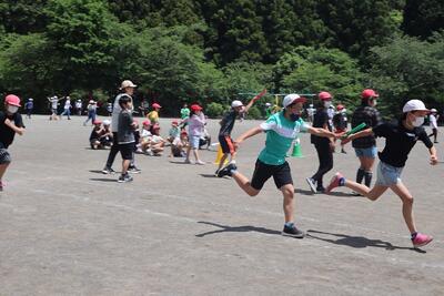 学校対抗リレー「バトンをつないで」では、どのチームも上手にバトンをつなぎ、大接戦となりました。