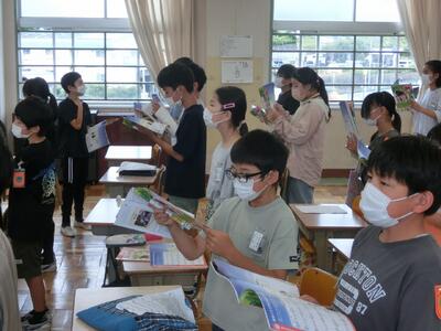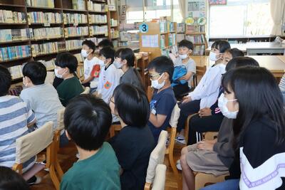 今日の昼休みには、令和5年度初めての「おたまじゃくしの会読み聞かせ」が行われました。図書室には、子供たちが集まり、ボランティアのみなさんの本の読み聞かせを聴き、その後にはシンガーソングライター田中みどりさんと一緒に校歌や歌を歌い、楽しい時間を過ごすことができました。