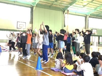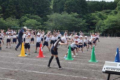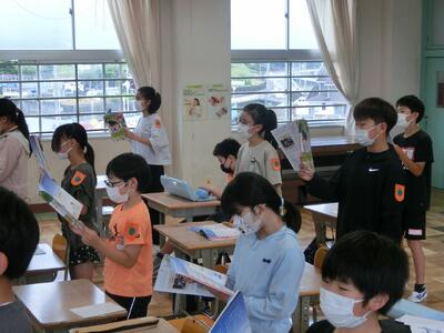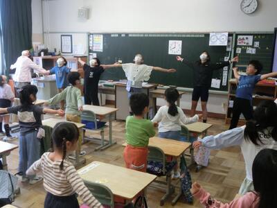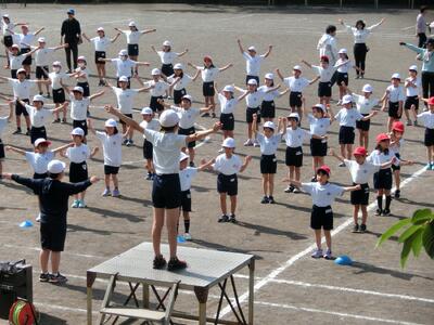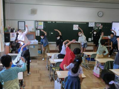 朝の時間、保健体育委員会の児童が1年生の教室へ行き、運動会に向けてラジオ体操の練習をしていました。