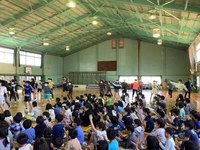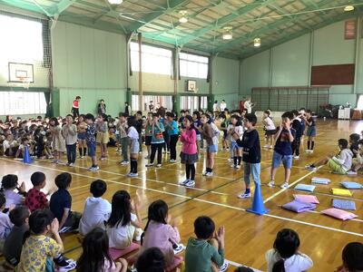 全校が体育館に集まり「1年生をむかえる会」が開かれました。沢地っこがみんなで集まって、各学年の出し物を披露するのは3年ぶりです。6年生と手をつないで、うれしそうに入場してきた1年生の子達は、3年生のジャンボリ・ミッキーと「はじめのことば」、2年生の「あいさつの歌」、4年生の「沢地小・校歌」、5年生の「沢地っこ体操」、6年生の「さわじしょうクイズ」をめいっぱい楽しんで大きな拍手をしていました。