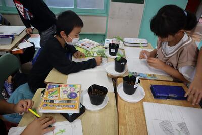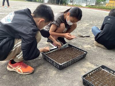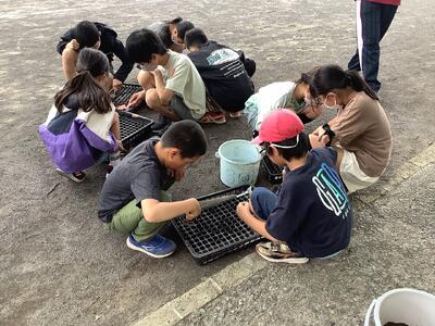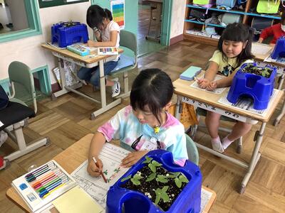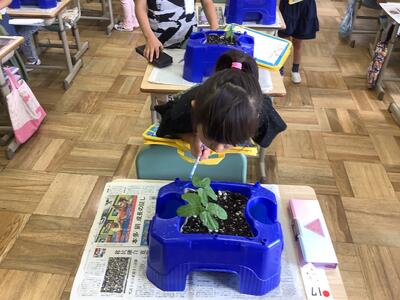 1年生の生活科では、子供たちがあさがおのたねをまきました。まずは、あさがおのたねをよく観て、絵を描きました。その後は、自分の植木鉢に土を入れて、たねを植えました。あさがおの芽が出るのが、楽しみですね。