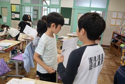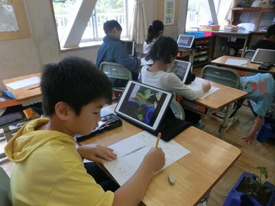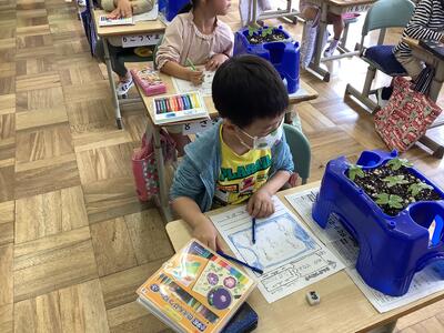 生活科の学習で、アサガオの観察を行いました。新しい葉が出てきている子も多く、葉の形や葉脈の様子など、細かい部分までよく見て観察カードにかいていました。