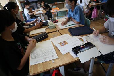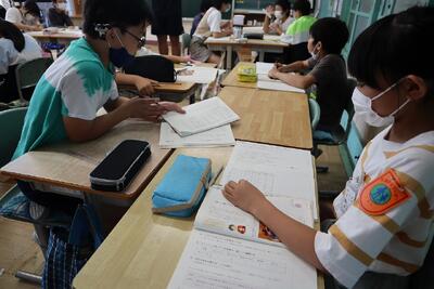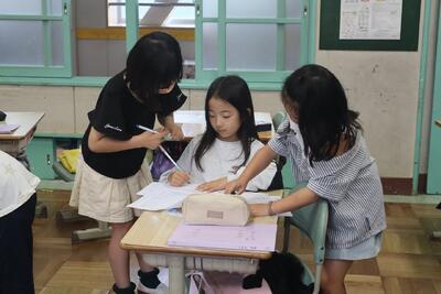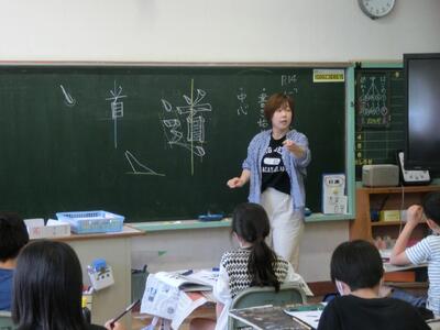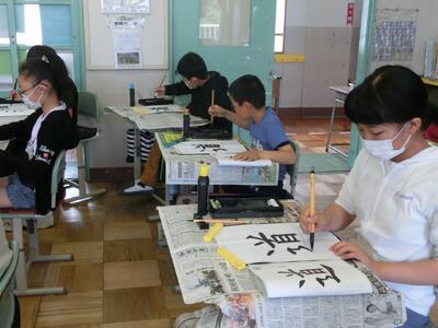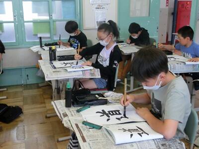 「しんにょう」を書く練習をしました。先生から書き方のこつを教わると、子供たちは黙々と練習に励んでいました。