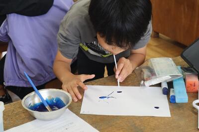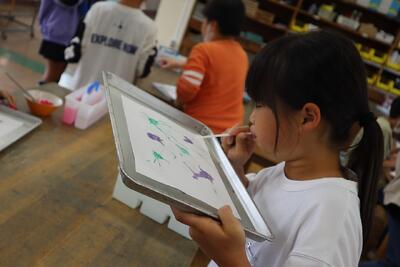 4年生の図工では、絵画技法の一つであるドリッピングを使って、子供たちが楽しみながらいきいきと活動しています。ストローで息を吹きかけて、絵の具で模様をつくっています。また絵の具をつけたビー玉を動かして、偶然にできる線をいかして、模様を描いていきます。子供たちの表情がとってもすてきです。楽しみながら活動することができました。