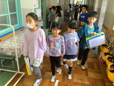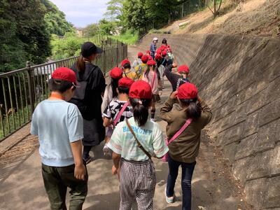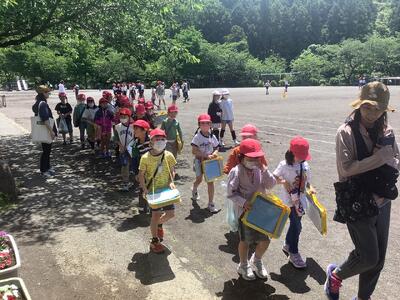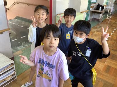 校区探検、出発時の様子です。今日は、富士ビレッジ方面に探検に行きました。今後、他の地区も探検します。
