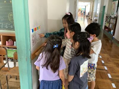 「5、10、15・・・」とみんなで声を出しながら、「〇時〇分」という時計の読み方を学びました。
