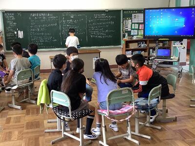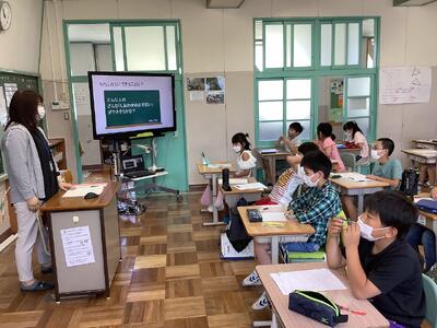 5年生の学活では、話合い活動が行われています。議題について、小柱にそって自分の考えを出し合ったり、小グループで意見をまとめたりして活動を進めていきます。司会者、記録者を立て、自分たちの力で話合っていきます。今日の学級会では、「運動会のスローガン」について話し合いました。メタモジを使うと、それぞれのグループの意見を共有できるので、話合いも深まります。