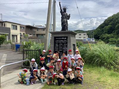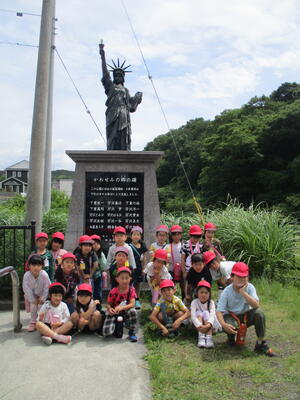 かわせみの郷方面へ行きました。女神の像の前で、集合写真を撮りました。