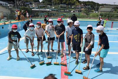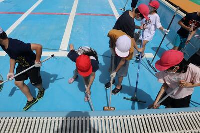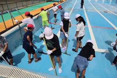 今日の5,6時間目に、6年生がプール清掃を行いました。ブラシを使ってプール内の汚れを取ったり、滑らないように入口やシャワーの場所をこすったりしてくれました。自分たちで仕事を探して、取り組める最上級生、大変立派です。運動会が終わり6月中旬から、低水位で低学年の水泳授業がスタートする予定です。