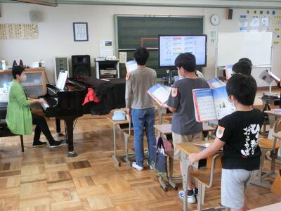 素敵な歌声が職員室まで聞こえてきたので、音楽室へ行ってみると、6年生が「明日という大空」という歌を歌っていました。明るく元気な歌声が、音楽室内に響き渡っていました。
