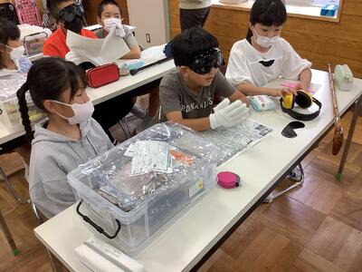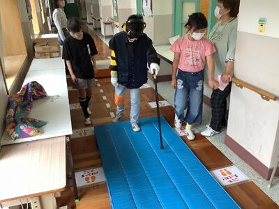 5年生の総合的な学習の時間の様子です。今回も社会福祉協議会の方々に協力していただき、高齢者体験を行いました。視野のせまさや見え方、体の動き方を擬似的に体験しました。