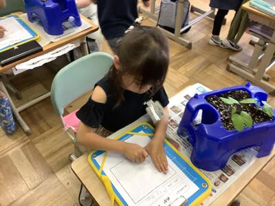 自分の植木鉢に植えた野菜の苗がどれだけ成長したかを観察し、気付いたことや疑問に思ったことを「みつけたよ」カードに記入しました。