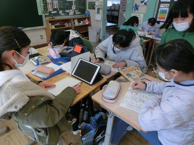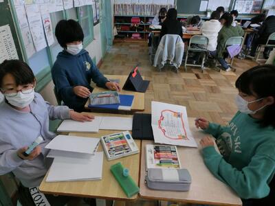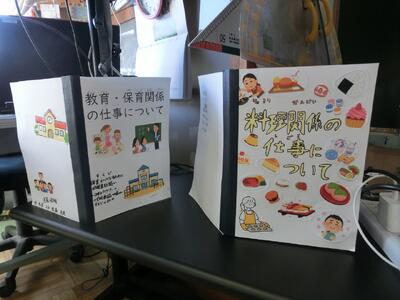 「医療関係の仕事」、「芸能関係の仕事」、「料理関係の仕事」など、11のグループに分かれて、調べたことを本にまとめました。完成した本は、下級生のために図書室に置かれるそうです。