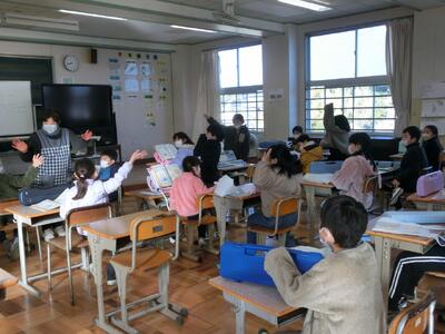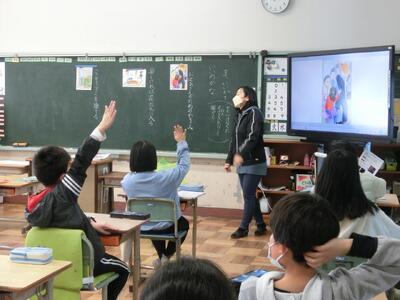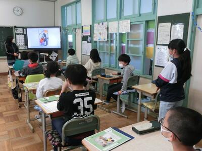 「かえるのうた」を輪唱で歌いました。「前に出てやりたい人はいますか?」と教師が聞くと、「やりたい、やりたい!」とたくさんの手が上がり、みんな楽しそうに歌っていました。