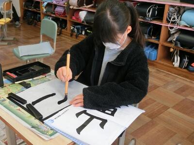 「山里」という字を練習しています。お手本をしっかり見ながら、良い姿勢で集中して取り組んでいました。毛筆の学習が始まってもうすぐ一年。みんな準備や片付けもとても上手になりました。